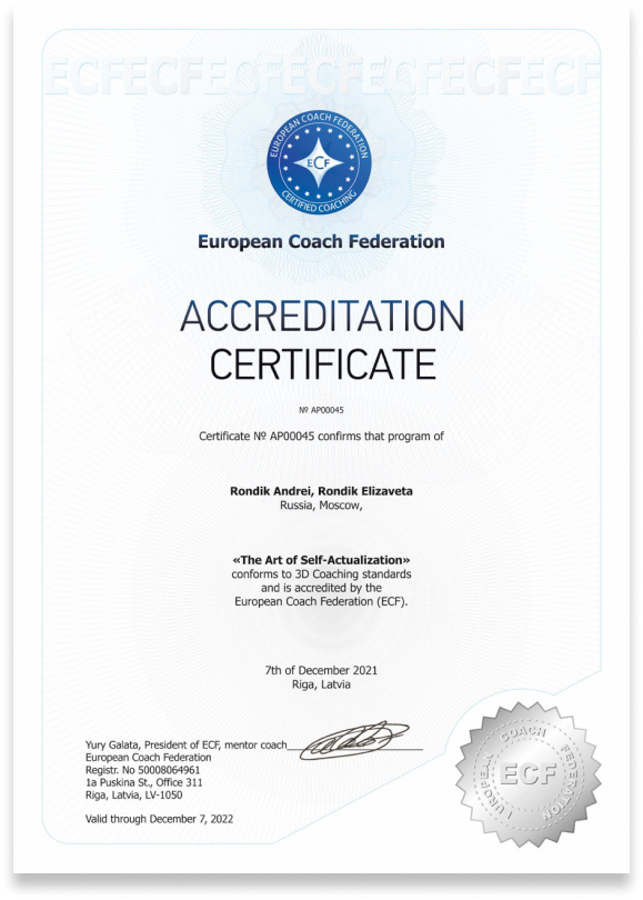 • Психолог-педагог, ИМЭС, психологическое консультирование 2021-2025 г • Базовый курс обучения глубинной психотерапии в интегральном подходе, Институт психологического консультирования «Новый Век» • Коучинг ст. ECF (European Coach Federation), Академия коучинга • ЛОРПт Личностно-ориентированная реконструктивная психотерапия, Е. Ляшковская, врач-психиатр, педагог НИИ психиатрии и неврологии им. В.М. Бехтерева • Интегральный подход в работе с психотравмой, Институт психотерапии и супервизии Берг • Цикл обучений психотерапии и гипнотерапии психосоматических и психогенных расстройств, Ассоциация психосоматики • Практический курс по работе с МАК, Институт психотерапии и супервизии Берг • НЛП-практик (Нейро-лингвистическое программирование), базовый курс • Прохождение личного психоанализа с 2018 года (7 лет, >600 часов), в подходах Шведской и Французской школ психоанализа • Прохождение супервизий у психоаналитика Шведской и Французской школ психоанализа и руководителя психоаналитического центра • Стаж практики коуча с 2018 года (>4000 часов) • Стаж индивидуальной психологической практики с 2022 года (>1500 часов) • Автор онлайн-школы интегративного коучинга и краткосрочной психотерапии, с аккредитованными программами обучения специалистов по стандарту ECF (European Coach Federation)